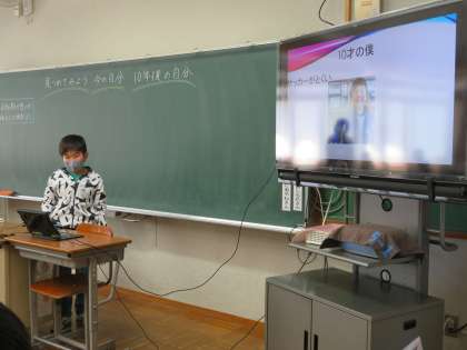 一人一人が,自分で作ったパワーポイントを使い,「今の自分」が得意なことや興味のあること,がんばっていることなどを述べた後,「10年後は,こんな自分になっていたい」という思いを発表しました。