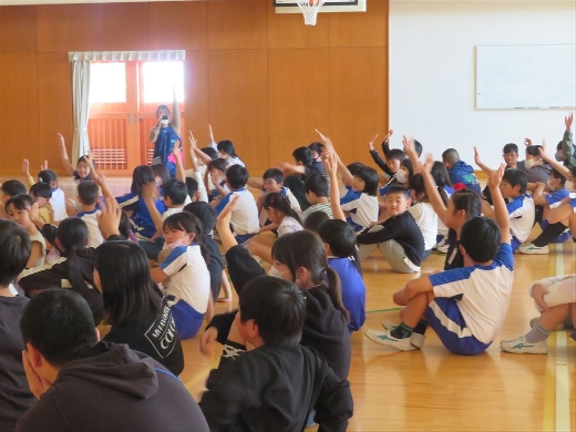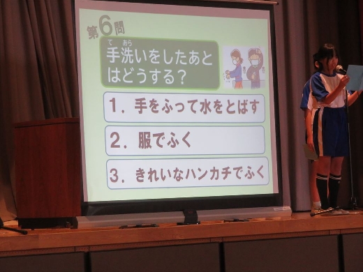 11月9日(金)に、保健委員会の児童を中心に手洗い集会が行われました。手洗いに関する実験の結果を示したり、クイズを出したりして楽しく手洗いの大切さを説明してくれました。