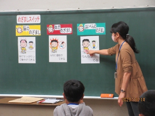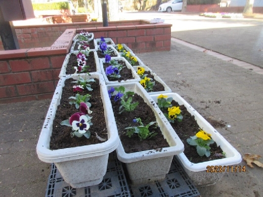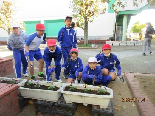 また、11月14日(火)には、5年生で食に関する指導が行われ、栄養教諭の先生から朝ご飯の大切さについてお話がありました。昼休みには、飼育栽培委員会の児童を中心に花壇の花の植え替えが行われ、昇降口前が華やかになりました。