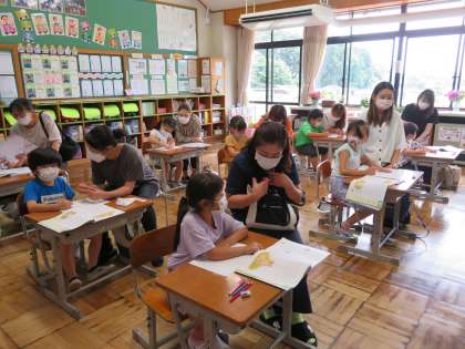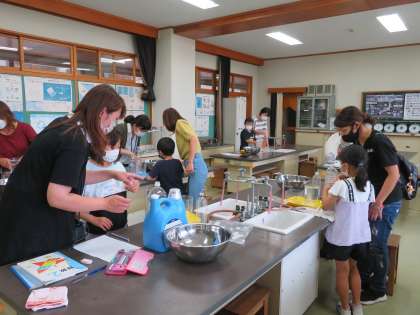 2年生は、算数の授業です。「かさをしらべよう」という課題で、お家の人の協力を得ながら、いろいろな入れ物に1Lと思うかさだけ水を入れました。