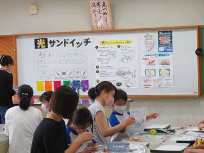 3年生は、図工で「光サンドイッチ」という課題を、光を通す材料を使って行いました。絵に描いた作品をどのようにに形にするか、お家の方と一緒に考えながら作り上げていました。子供たちも楽しそうに取り組み、とても素敵な作品ができました。