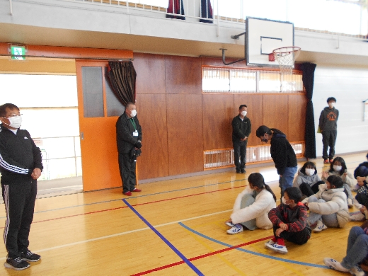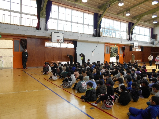 不審者確保の合図の後、全児童が速やかに体育館に避難しました。避難の約束「お・か・し・も」をよく守って避難しました。