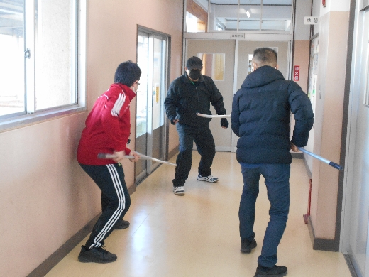 職員は、不審者が校内に侵入した際に、発見者からの速やかな連絡そしてさすまたを使って複数で対応する訓練を行いました。