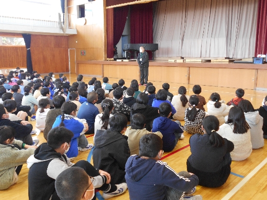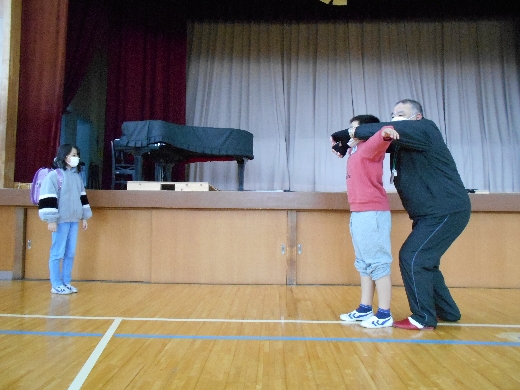 体育館では、安全教育担当職員司会のもと、境警察署のスクールサポーターの平松様より不審者対応に関するお話をしていただきました。集団で約束を守ってしっかり避難すること、危険な場面では大きな声で助けを呼ぶ必要があるので普段のあいさつから声を出すことが大切であることを教えていただきました。その後、6年生の代表児童2名と不審者につかまれた時の対応を教えていただきました。