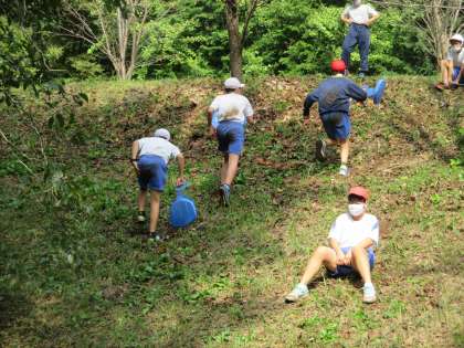 芝すべり、ボール遊び、バドミントン、フリスビー、散策など自由に活動しました。色々工夫して楽しく友達と過ごしました。この後は、プレールームで王様ドッジボールを行いました。レク係を中心に、楽しくみんなで楽しみました。