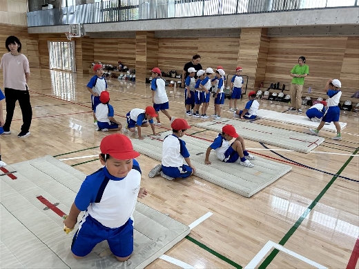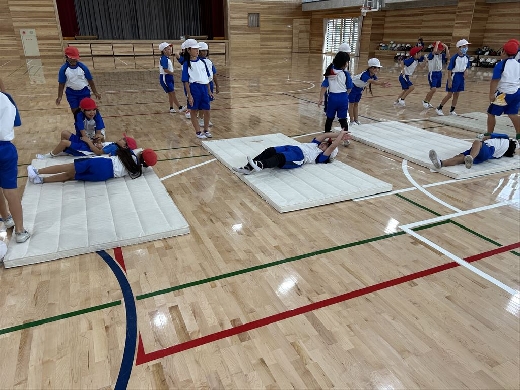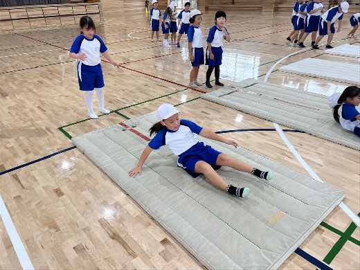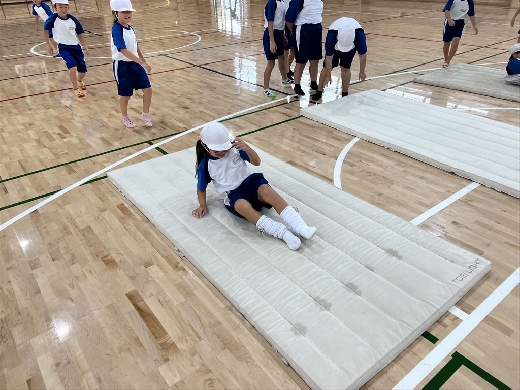 体育では、「前転」や「後転」を中心に練習しています。技のポイントをおさえて練習する姿がみられました!