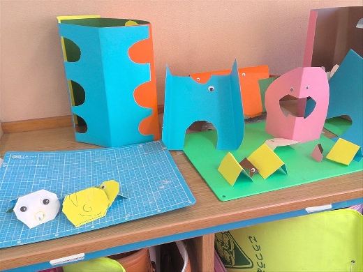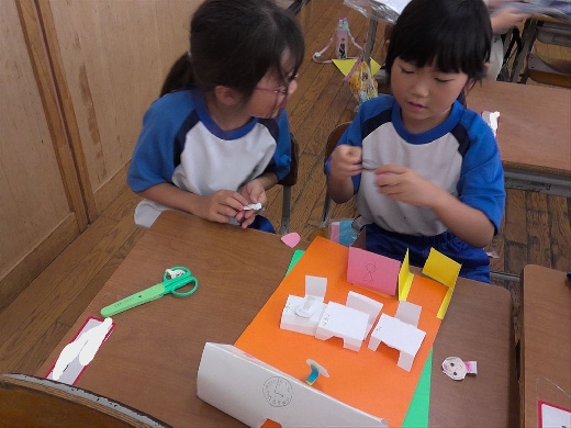 1年生の図画工作では、紙を折って自立させることを楽しむ「おってたてたら」の学習を行いました。