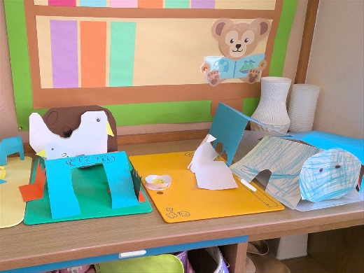 子どもたちは、まず一枚の紙を使い、どうすれば倒れずに立つのかを試行錯誤しました。立つことがわかったら、今度はその形から想像を広げて作品を制作しました。立ち上がった形が動物に見えたり、建物に見えたり、不思議な生き物に見えたりと、子どもたちの豊かな発想力に驚かされました。