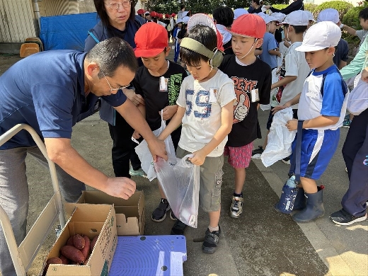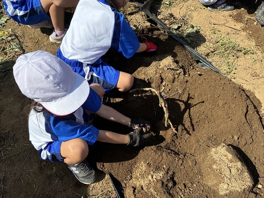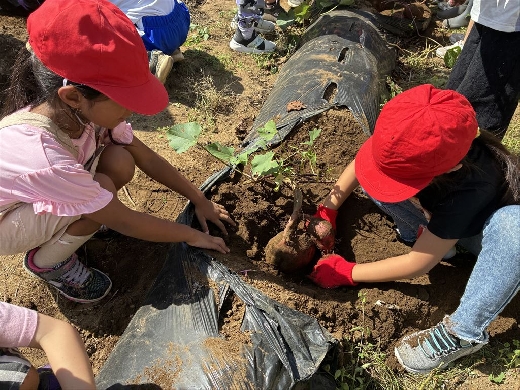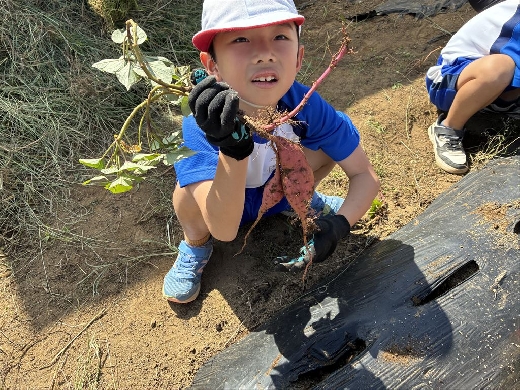 今回もJAの方々にご協力いただき、掘り方を教えていただきました。子どもたちは軍手をはめ、土の中のサツマイモを探しました。「あったよ!」「うわー、大きい!」と、土の中からサツマイモが出てくるたびに、歓声が上がりました。