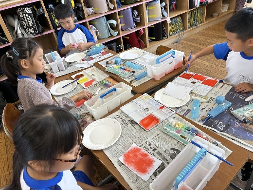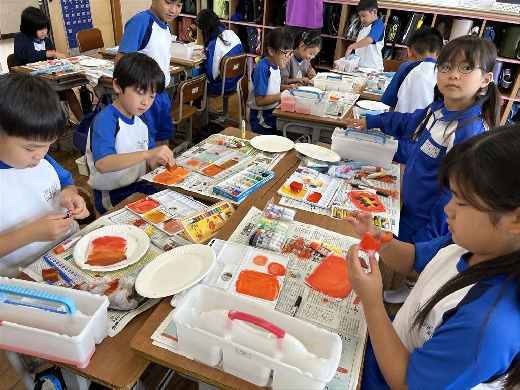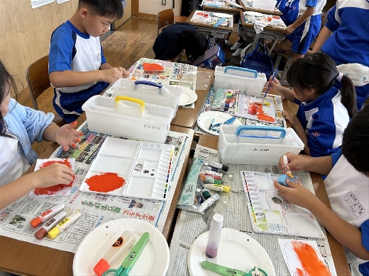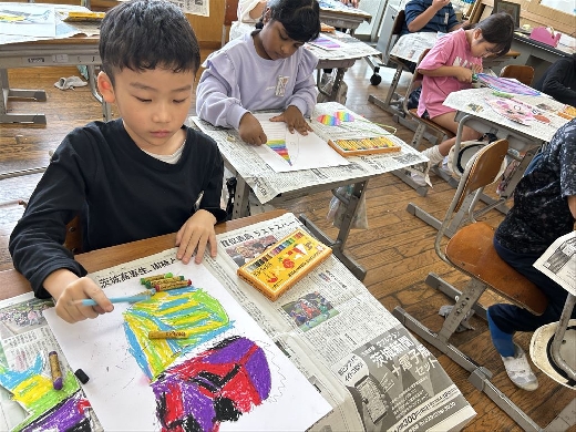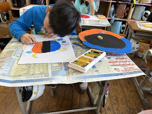 図画工作では、秋の作品展に向けて、「ふしぎなたまご」を描いています。クレヨンを使って、丁寧に仕上げられるよう頑張っています。