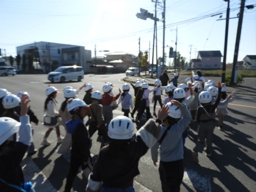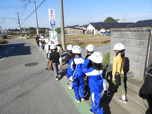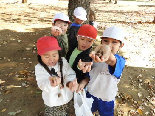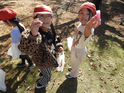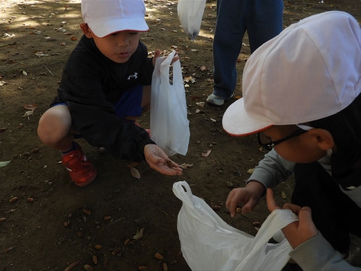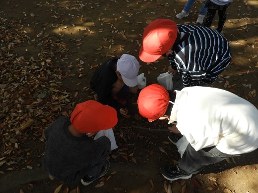 交通ルールを守って八坂公園へ出かけた1年生は、地面いっぱいに落ちた様々なドングリを夢中になって拾い集め、色づいた落ち葉の絨毯など、秋の自然を全身で体験しました。