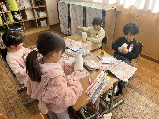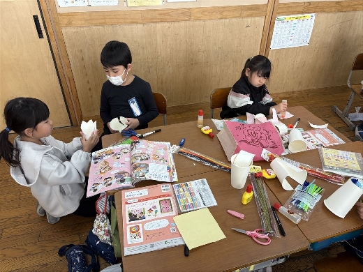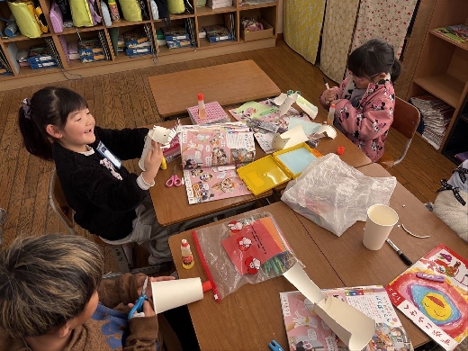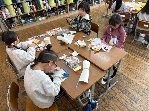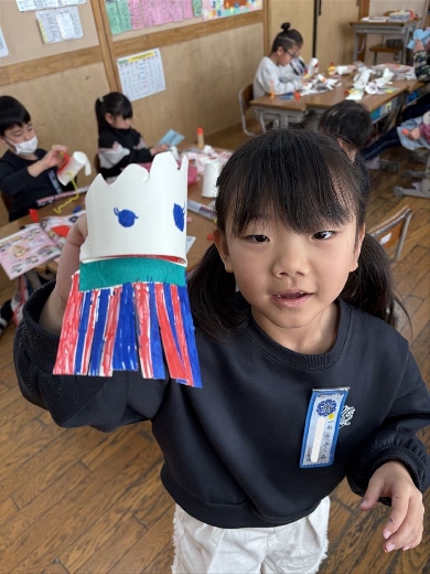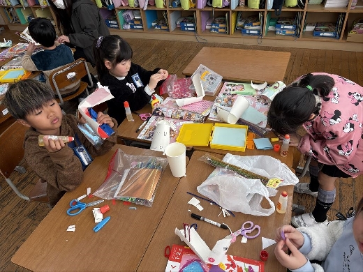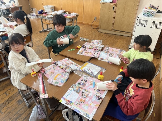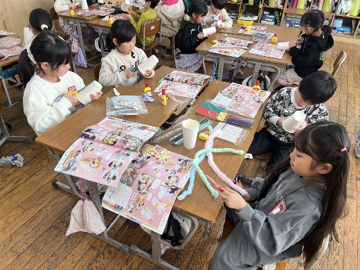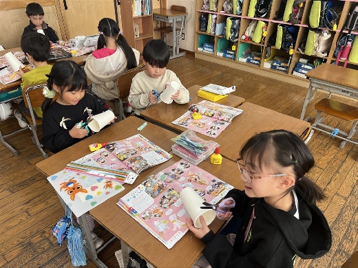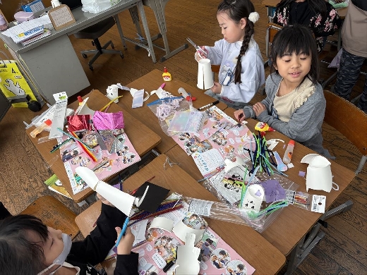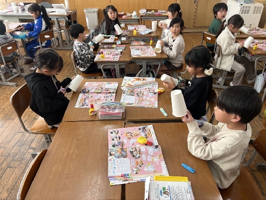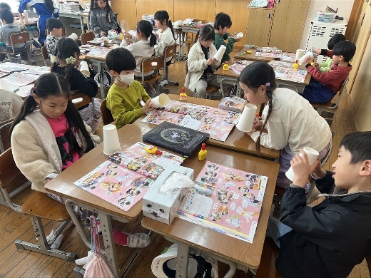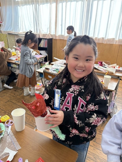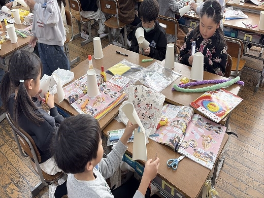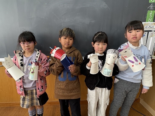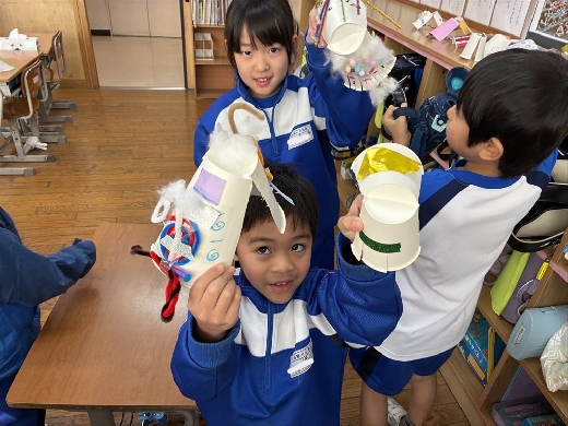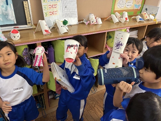 1年生の図工で、口がパクパク動くおもちゃ「ぱくぱっくん」を作りました。紙コップを切って折ってできた形から想像を膨らませ、モールや折り紙、ペンで飾り付けて自分だけの素敵なキャラクターを完成させました。出来上がった後は、友達の作品とおしゃべりをさせるなど、手作りのおもちゃを動かして遊ぶ楽しさを満喫しました。