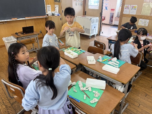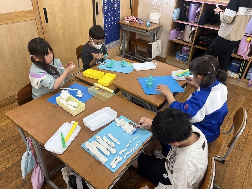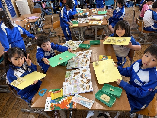 色々な握り方で、ねん土の形作りに挑戦しました!食べ物や動物など、様々な作品ができました。
