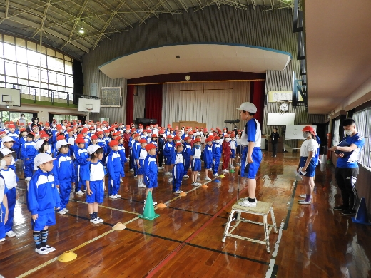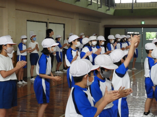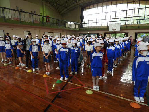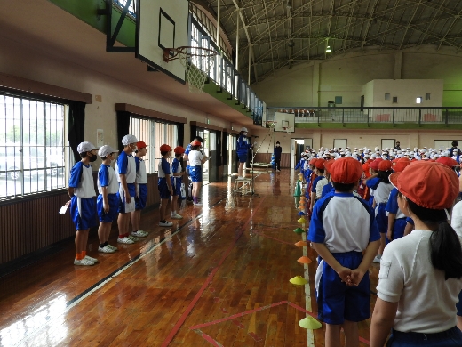 運動会全体練習の様子です。雨天のため、体育館で閉会式を中心に行いました。本日の練習も代表委員会児童が中心となって説明をして取り組みました。自分たちの運動会であるという考えを大切に行っています。また、応援団長の自己紹介もありました。岩井一小の児童のリーダー性を大いに発揮し心を一つにして、練習に取り組んでいます。