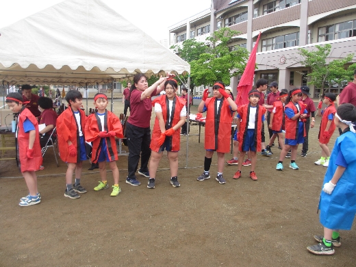 運動会の応援合戦の様子です。赤組白組ともに気合の入った応援でした。三々七拍子に合わせたり校歌を歌ったりしてそれぞれの組の勝利を願い、一体となって応援しました。まさに、本年度のスローガンにある「一致団結」した応援合戦でした。