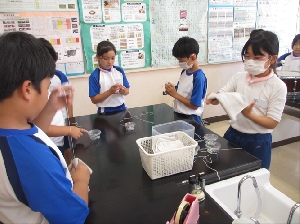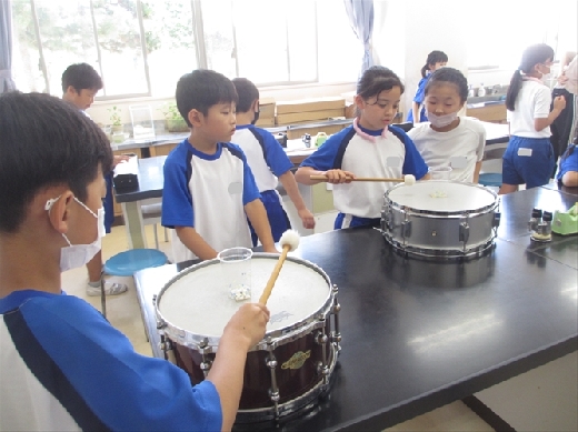 3年生の理科の授業の様子です。音の振動についての学習です。「音の大きさがかわると ふるえ方はどのようにかわるでしょうか。」という課題について、実際に、たいこやモノコード、かいじゅうスピーカーを使って、確かめました。意欲的に取り組みました。