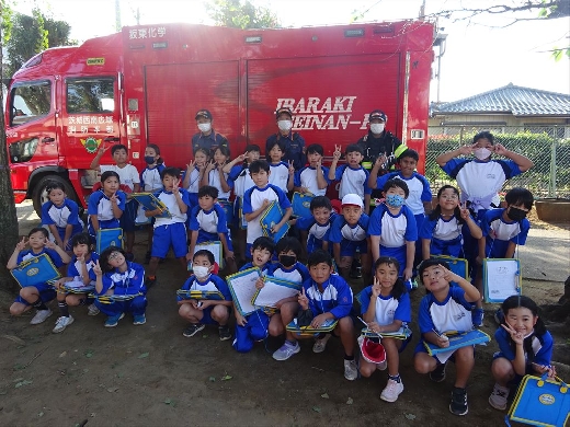 10月28日に3年生が、坂東消防署の方をお招きして、社会科出前授業を行いました。消防署の1日の仕事や消防車について、詳しく話を聞いたり体験したりしました。児童たちは、消防車のホースなどの設備や、防火服を実際に見ることができ、とても良い体験となりました。