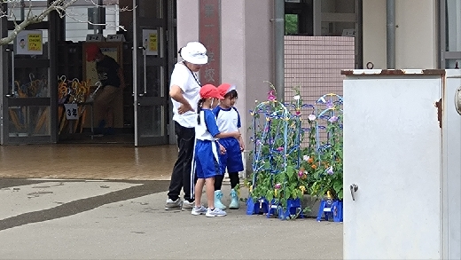 今日は曇り空で午後1時現在の気温は30度でした。この温度が涼しいと感じるのですから、昨日までがいかに暑かったかがわかります。夏休みまであと少しのところまできた子供たちは、暑さに負けることなく、元気いっぱい生活しています。休み時間には先生方とサッカーをしたり、朝顔の観察をしたりする様子がみられました。先生と子供たちの交流もさかんです。自分と関わる人たちと仲良くすることも、集団生活の大切な目的です。みんなが笑顔で元気に過ごせますように!それが一番の願いです。