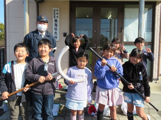 飯島駐在所では、警察官の方が身に付けているもののを紹介していただいたり、仕事の内容をお話ししていただいたりしました。