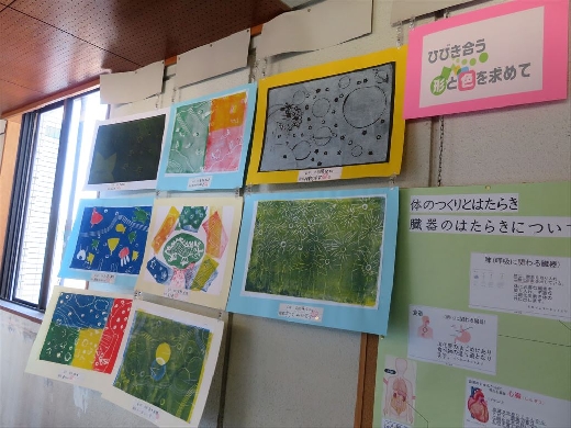 6年生は、「思い出を言葉に」と「ひびき合う形と色を求めて」です。一人一人が、6年間の思い出を伝えるために表現を工夫して書きました。また、ステンシル版画に挑戦し、色の重なりや形の面白さを味わいました。
