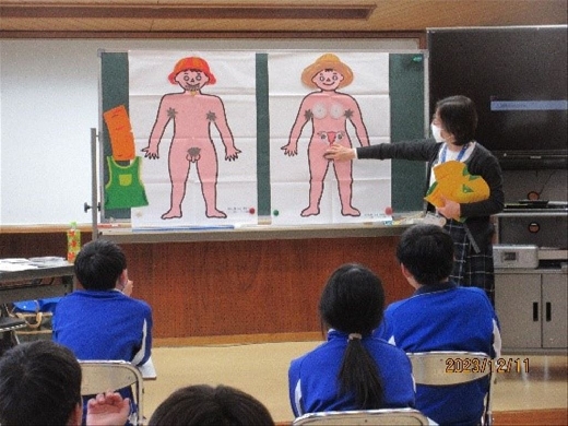 12月11日(月)に、6年生を対象とした「命の授業」が行われました。講師は、坂東市健康づくり推進課より、保健師の山根様と助産師の西出様をお招きしました。初めに、「大切な自分」と題して、思春期の体の変化(精通、初経等)やプライベートパーツ(自分だけの大切な場所、見せたり触らせたりしない場所)などについて説明がありました。他者との距離感を考えたり、自分の身を守るために、手を突き出して「やめて!」という拒否の仕方を体験したりしました。次に、動画を視聴しました。お母さんが、生まれてきた赤ちゃんに初めてかけた言葉は何でしょう?という質問があり、児童はいろいろと想像を巡らせながら発表していました。助産師の西出様からは、「帰宅したらお母さんに聞いてみてね。」と宿題が出されていました。ちなみに、生まれてきた赤ちゃんにお母さんが最初にかける言葉第4位が「よかったね」第3位が「やっと会えたね」第2位が「頑張ったね」第1位は「ありがとう」だったそうです。最後は、赤ちゃん人形を抱っこする体験をしました。将来に向けた「命の尊さや自他を大切にする」貴重な授業となりました。