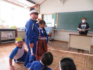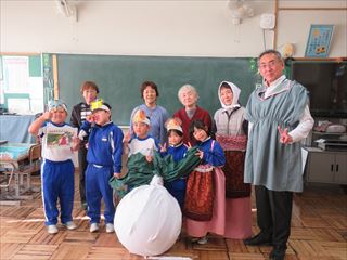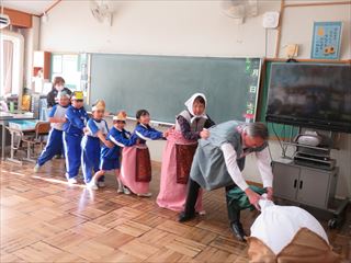 1年生では、ボランティアの方による朗読に合わせて、みんなで「おおきなかぶ」を引き抜く体験をしました。物語の世界に入り込みながら、友だちと協力してかぶを引き抜く動作を楽しみ、笑顔あふれるひとときとなりました。