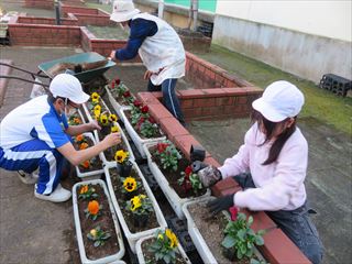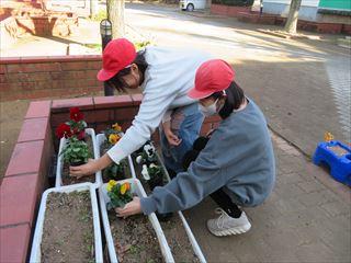 昇降口付近にパンジーの苗を植えているとき、近くにいた子どもたちが「手伝います!」と声をかけ、自発的にお手伝いをしてくれました。