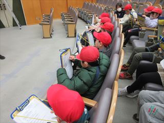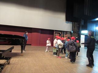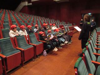 ベルフォーレでは、音楽ホールの会場に入ったり、楽屋や舞台の裏側を見せていただいたりし、普段はなかなか見ることのできない場所に子どもたちは目を輝かせていました。施設の方から説明を聞き、音楽ホールの役割や工夫について学びました。