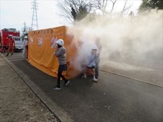 避難訓練では、火災を想定して実施しました。避難後には、6年生が水消火器体験を行い、全校児童が煙体験にも取り組みました。