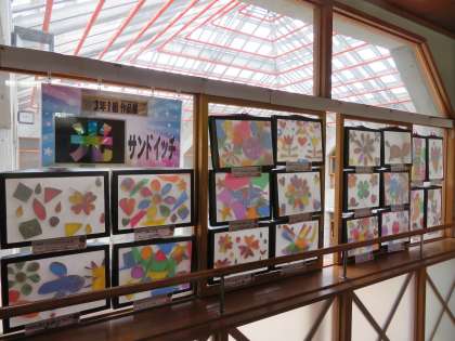 3年生は、図工で製作した「光サンドイッチ」です。いろいろなセロファンを駆使して仕上げました。窓に差し込む光に反射して、素敵なデザインが見えてきます。