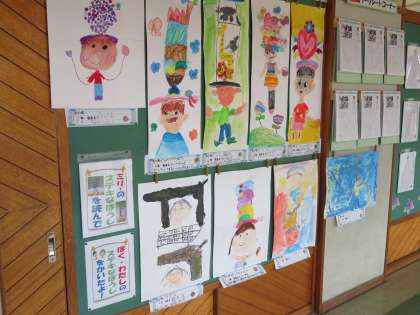 飯島小の廊下には、各学年のさまざまな作品が掲示されています。