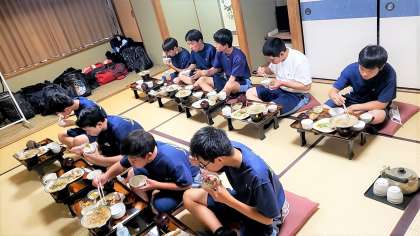 旅館でとる食事は全て部屋食ですが、新型コロナウイルス感染症対策として、全員、同じ方向を向き、黙食での食事となります。しっかり食べて、ゆっくり休養をとり、明日に備えて欲しいです。