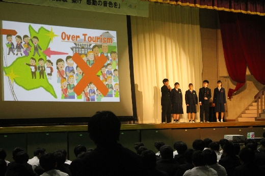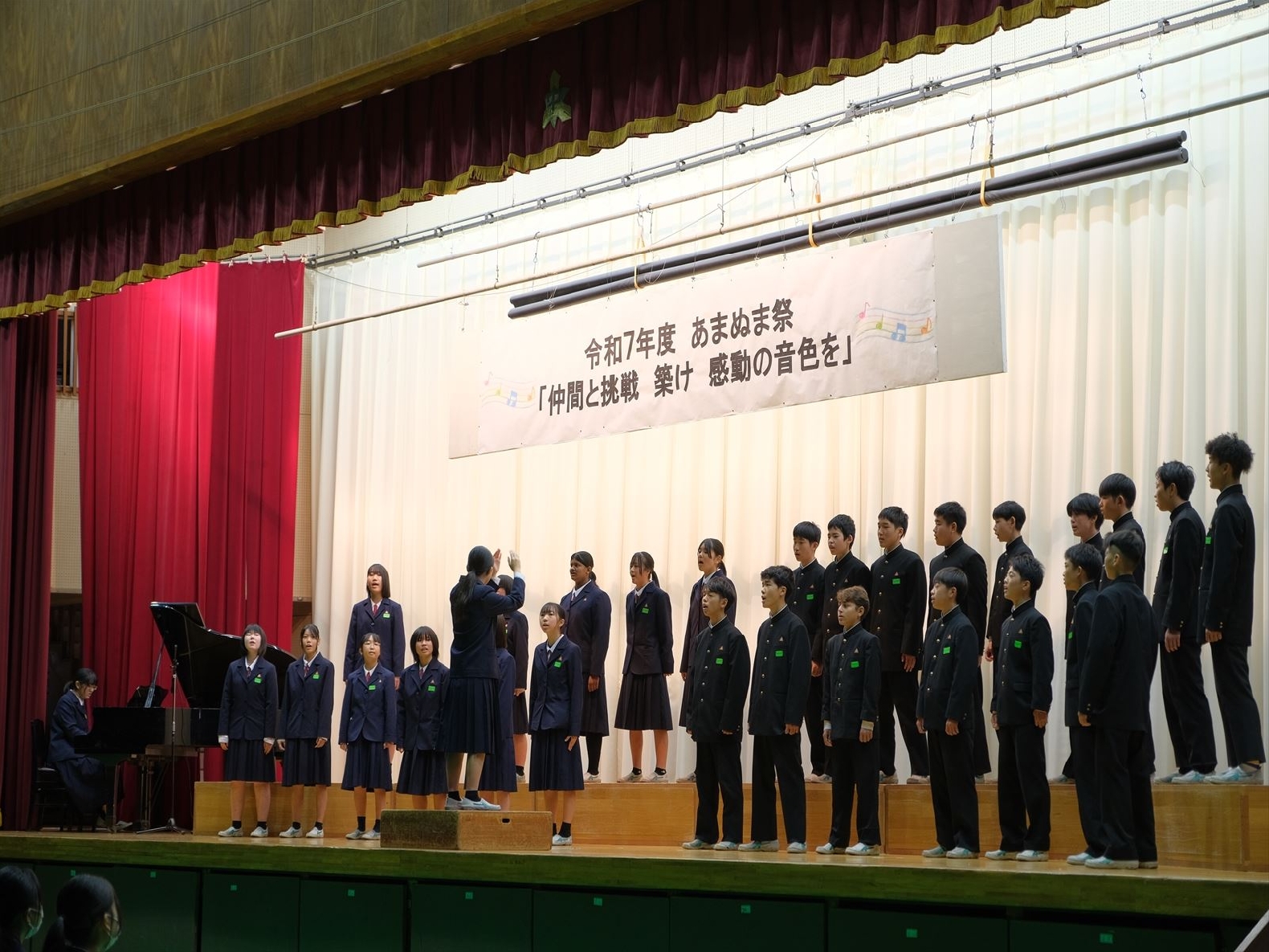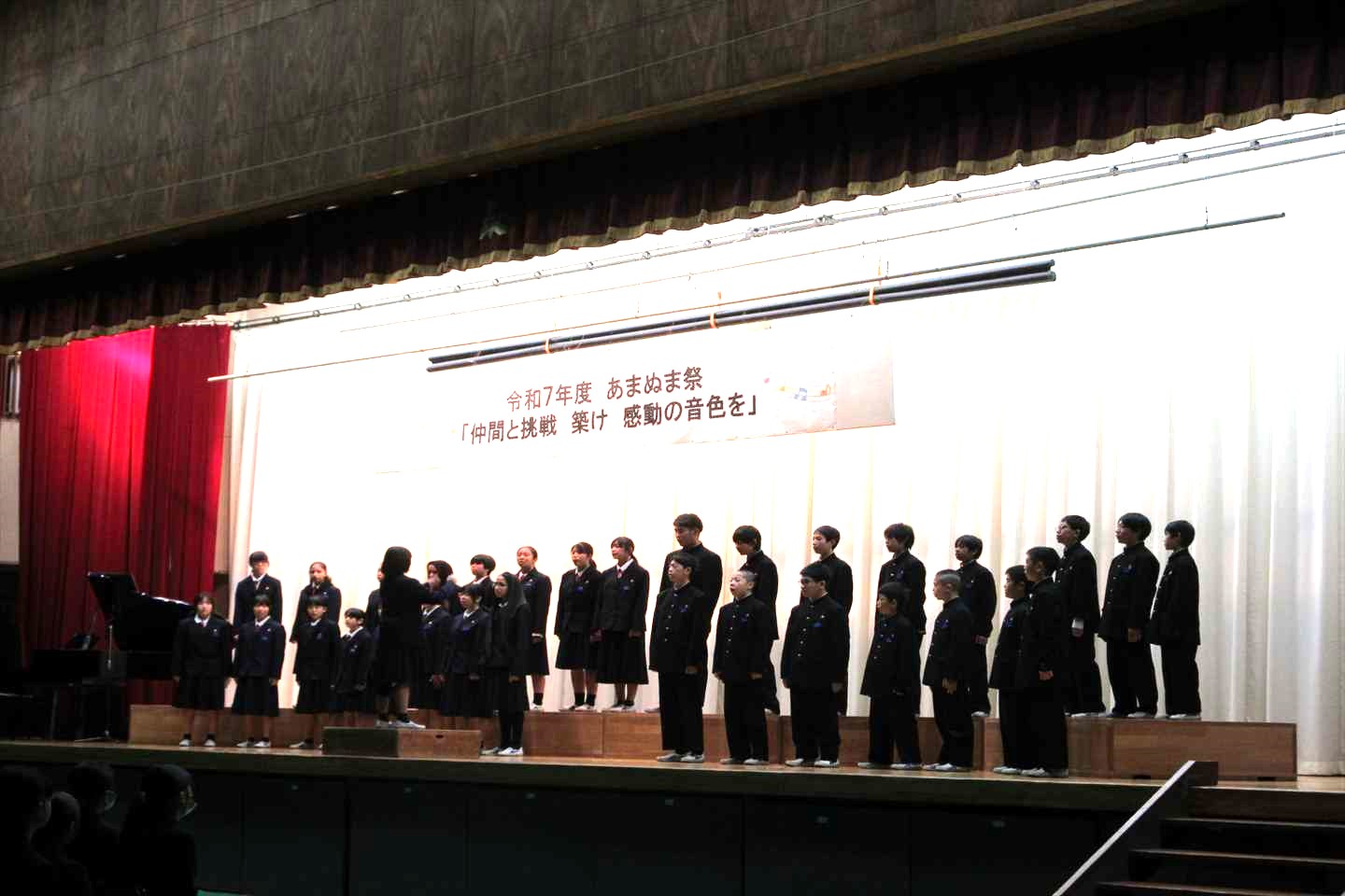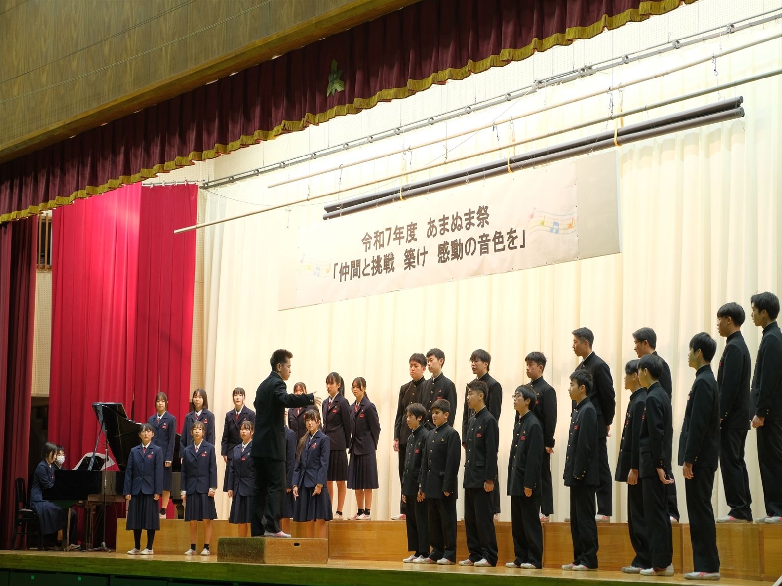 午前の部は合唱コンクールが行われ、素晴らしい歌声が披露されました。この2か月間、金賞を目指してクラス一丸となって努力したこともあり、熱い思いが観客を魅了していました。結果発表の際には喜びの涙や悔し涙を流す生徒が多く見られました。合唱をとおして、本校の目指す「自律」と「共創」が育まれたのではないかと思います。