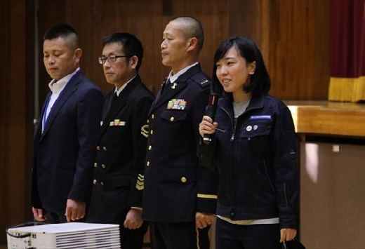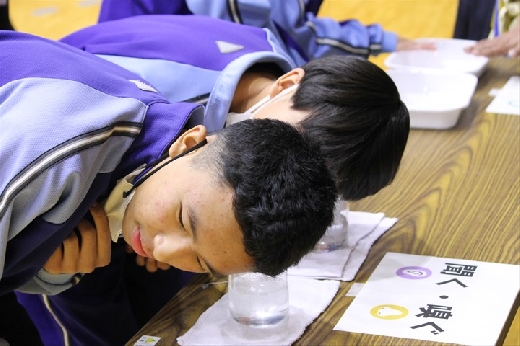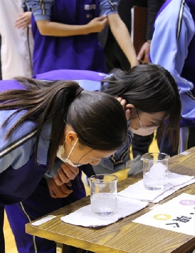 講演会には自衛隊の方も参加していただき、南極の氷を提供していただきました。全校生徒が本物の氷を実際に見て、触って、匂いを嗅ぎ、普通の氷との違いを体感させていただくことができました。生徒たちも氷が溶ける際にパチパチ音がすることに驚きの声を上げていました。