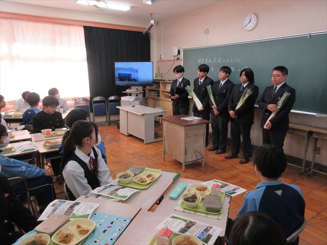 本日は坂東清風高校で栽培したネギが市内の小中学校の給食に提供されました。本校には5名の高校生が来校し、3年生の代表生徒にネギ生産の工夫や農業の未来などについても説明していただきました。この様子は全学級にオンラインで配信されました。農業の魅力について話を聞き、給食の味もさらにおいしく感じられました。