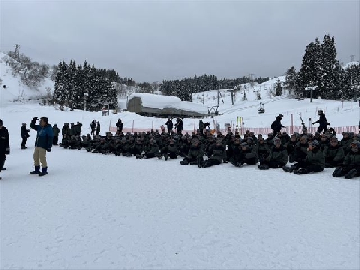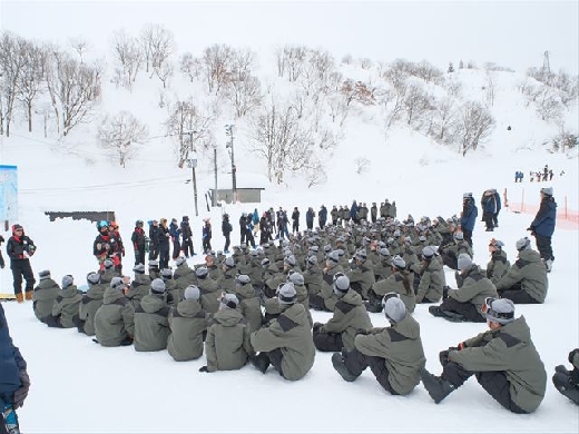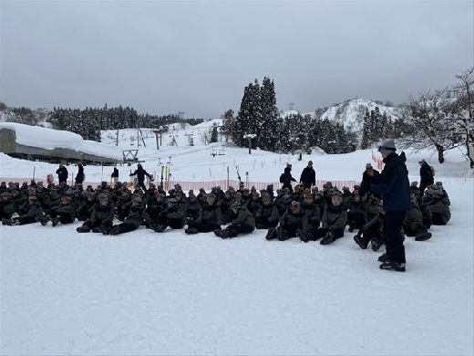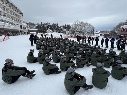 昼食後の13時30分すぎからスキースノーボード講習の開講式が行われました。ホテル前のゲレンデでインストラクターの皆さんへご挨拶しました。雪も降っていないので、初日の基礎練習にはちょうど良い天候です。