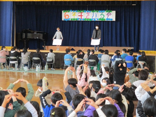3月9日、「6年生を送る会」を実施しました。1年生と一緒に入場した6年生、1年生もうれしそうでした。お世話になった6年生に、各学年から手作りのプレゼントが渡されました。2年生が作成したカードが添えられ、1年生手作りの鉢に植えられたパンジーの花、3年生からのメダル、4年生からのメッセージカード、5年生からの色紙。その全てが、感謝の気持ちが込められたものでした。プレゼント贈呈の後は、全校児童で、〇×クイズやじゃんけんゲームで遊びました。翌日、6年生からは、1~5年生全員に手作りのしおりが贈られました。