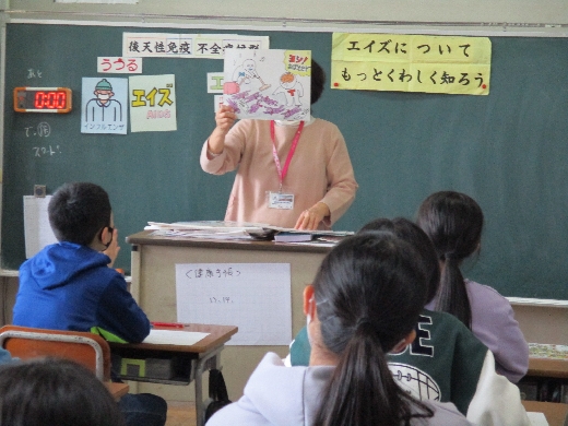 忍田養護教諭による6年生の保健の授業の様子です。テーマは、「エイズについて、もっとくわしく知ろう」です。エイズについての正しい知識を得るために、児童は真剣に学習に取り組んでいました。
