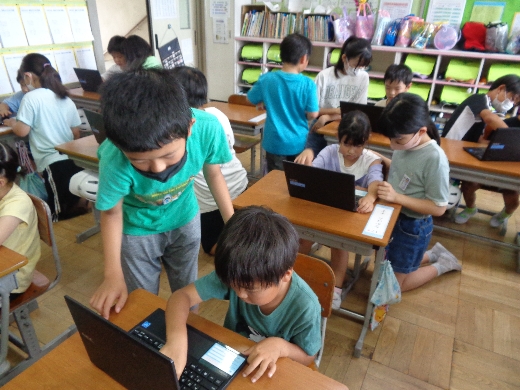 1年生が初めてPCを立ち上げるので、6年生がお手伝いに来てくれました。電源を入れて、パスワードを入力して、eライブラリを開く作業を一つ一つ丁寧に教えてもらいました。1年生も6年生も、とても楽しそうに活動していました。