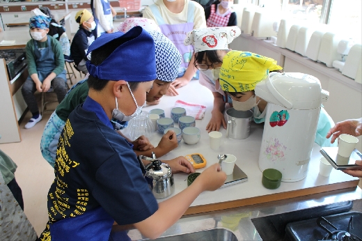 5月2日(木)、5年生の家庭科で出前授業を行いました。お茶の先生として花水晃子先生をお迎えし、お茶の入れ方やお茶の種類などを教えていただきました。お茶、紅茶、ほうじ茶を飲み比べたり、自分たちでお茶を入れて飲んだりして、とても充実した授業となりました。