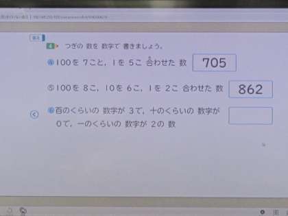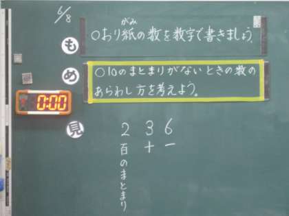 今日は,10の位が0になる数の表し方を学習しました。百の位,十の位,一の位それぞれで,百,十,一のまとまりがいくつあるかを考えることで,十の位が0になる数の表し方(読む・書く)を学びました。