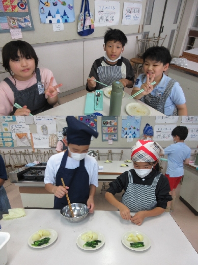 家庭科の学習で、5年生が調理実習を行いました。今回は、初めてガスコンロを使っての調理。ほうれん草をゆでたり、新じゃがを使って小吹芋を作ったりしながら、鍋の正しい使い方やゆで加減の見方などを学びました。