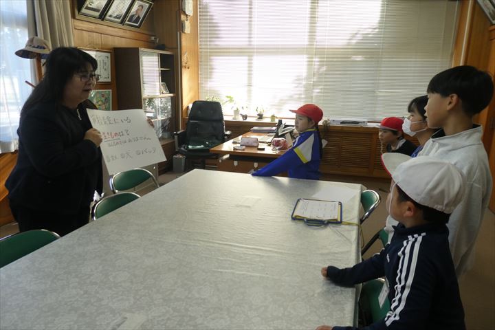 子どもたちは班ごとに校内を巡り、先生を見つけてクイズに挑戦。クイズに正解するとキーワードがもらえ、そのキーワードを組み合わせて文章を完成させるという活動です。