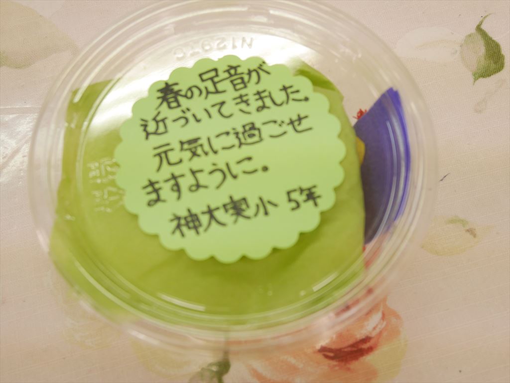 総合的な学習の時間に行っている福祉学習の一環として、5年生が社会福祉協議会を通して、一人暮らしのお年寄りの方へプレゼントを届けました。春の訪れを感じていただけるよう、黄色い春の花とともに、「春はもうすぐです」「いつまでも元気でいてください」という思いを込めたメッセージやお守りを添えました。