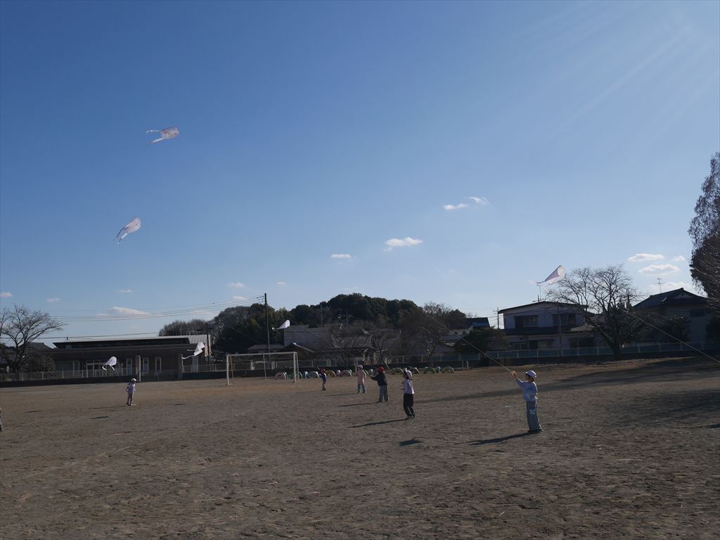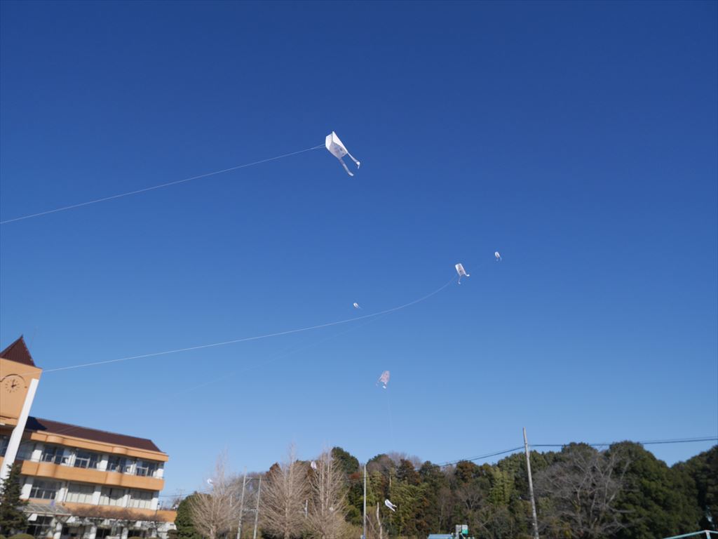 「わあ、あがった!」「高い、高い!」と、目を輝かせながら歓声をあげる子どもたちの姿がとてもほほえましく感じられました。冬の青空に白い凧が高く舞い上がり、空とのコントラストもとてもきれいでした。