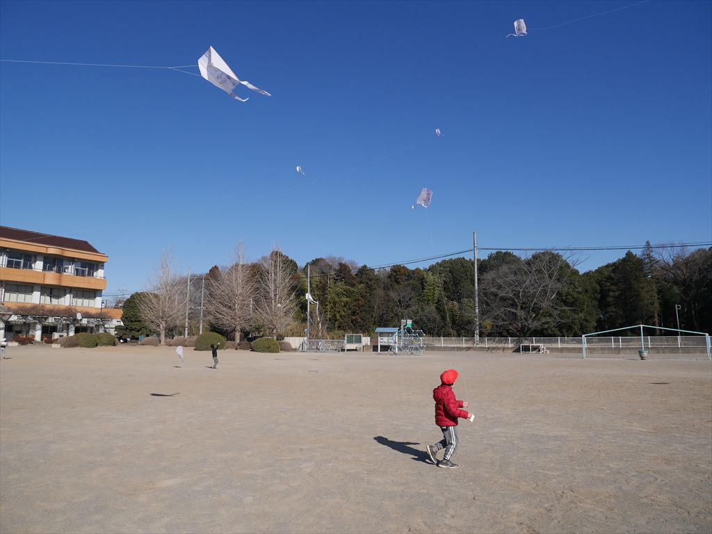 生活科の学習で作ったオリジナルの凧をあげました。初めて凧あげに挑戦する子どもも多く、一生懸命走ったり、糸を手繰り寄せながら風をつかもうとしたりと、試行錯誤しながら取り組んでいました。