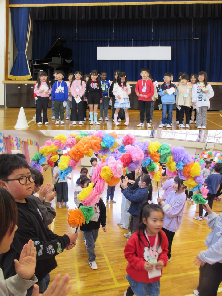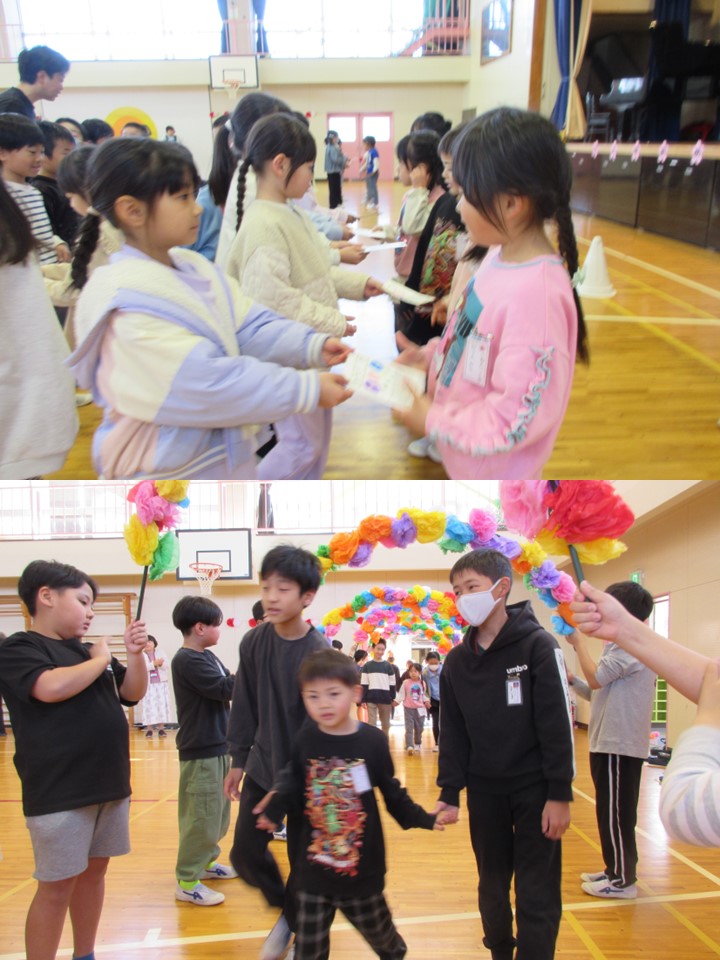 体育館で「新入生を迎える会」が開かれました。メダルや朝顔の種など、心こもったプレゼントをあげたり、じゃんけん列車などのレクリエーションをしたりしながら、楽しい時間を過ごすことができました。優しいお兄さんお姉さんと一緒にすごし、1年生も笑顔いっぱい。さっそく神大実小学校の「大好き」を見つけられました。