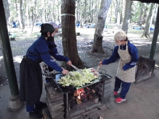 焼き板作りが終了すると、いよいよお待ちかねのバーベキュータイムです。火おこしの説明を聞いた後、4つのグループに分かれて、バーベキュー開始です。肉たっぷりの野菜炒め(?)と焼きそばがメニューです。火おこし担当、食材担当、用具・食器担当に分かれて協力して活動しました。