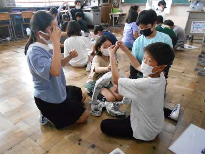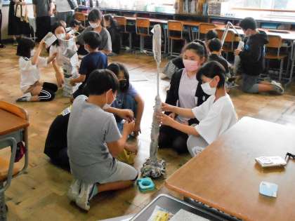 次は、5年1組です。学級活動で、協力して目標を達成する活動「新聞タワーを作ろう」を行いました。新聞紙をつかってできるだけ高いものを作る目標に向かって、協力して活動していました。