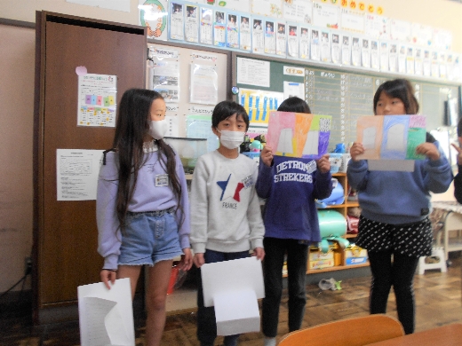 16日(水)の2時間目、2年生が国語の授業で「おもちゃの作り方を説明しよう」という課題に取り組みました。グループで協力して、おもちゃの作り方の絵を4枚の紙に描いて、それに対応する説明を書きました。そして、グループで発表の練習を行いました。写真は、グループで発表の練習をしているところです。みんな、すらすらと説明することができました。本番も頑張ってくださいね。